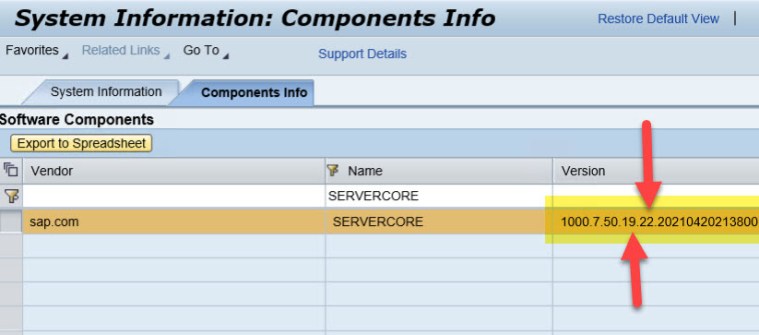 - Find current J2EE-APPS version. Take note on the arrow highlighted and as per below screenshot, the SAP AS JAVA version is at version 7.50, support package 19 and patch level 22.